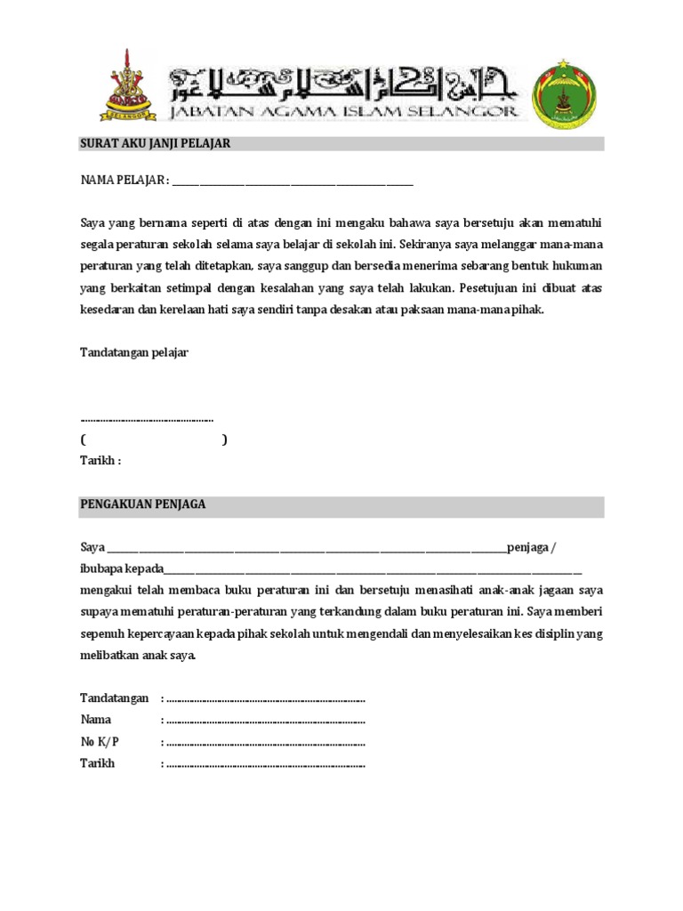 _____ SURAT AKUJANJI PERJANJIAN JAMINAN BERKELAKUAN BAIK Bahawa saya _____ Tingkatan _____ mengaku untuk berkelakuan baik dan mematuhi segala peraturan. Contoh Surat Aku Janji Pelajar Cemerlang Bahawasanya kami berikrar dan berjanji kepada semua guru dan ibu bapa akan berusaha bersungguh sungguh bagi mencapai kejayaan. View surat aku janji muridpdf from AA 1SURAT AKU JANJI MURID Diisi dalam 2 salinan i Salinan Ibu BapaPenjaga ii Salinan Pihak Sekolah NAMA MURID.